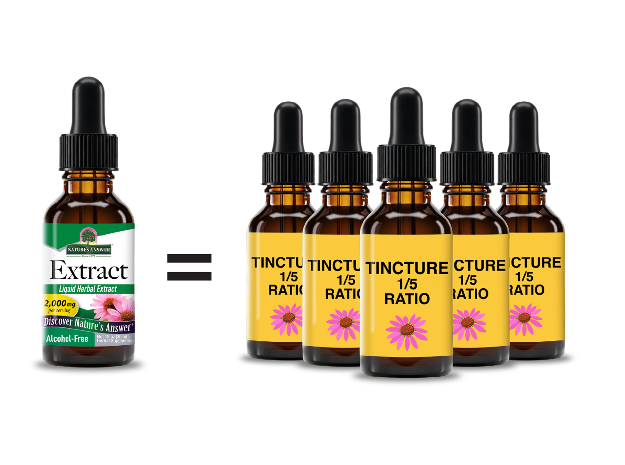 Nature's Answer Herbal Extracts provide a concentrated form of the herb, while tinctures are often more diluted. Our true 1:1 Extracts deliver 1,000 mg of dry herb per 1ml serving, where tinctures may provide much less.