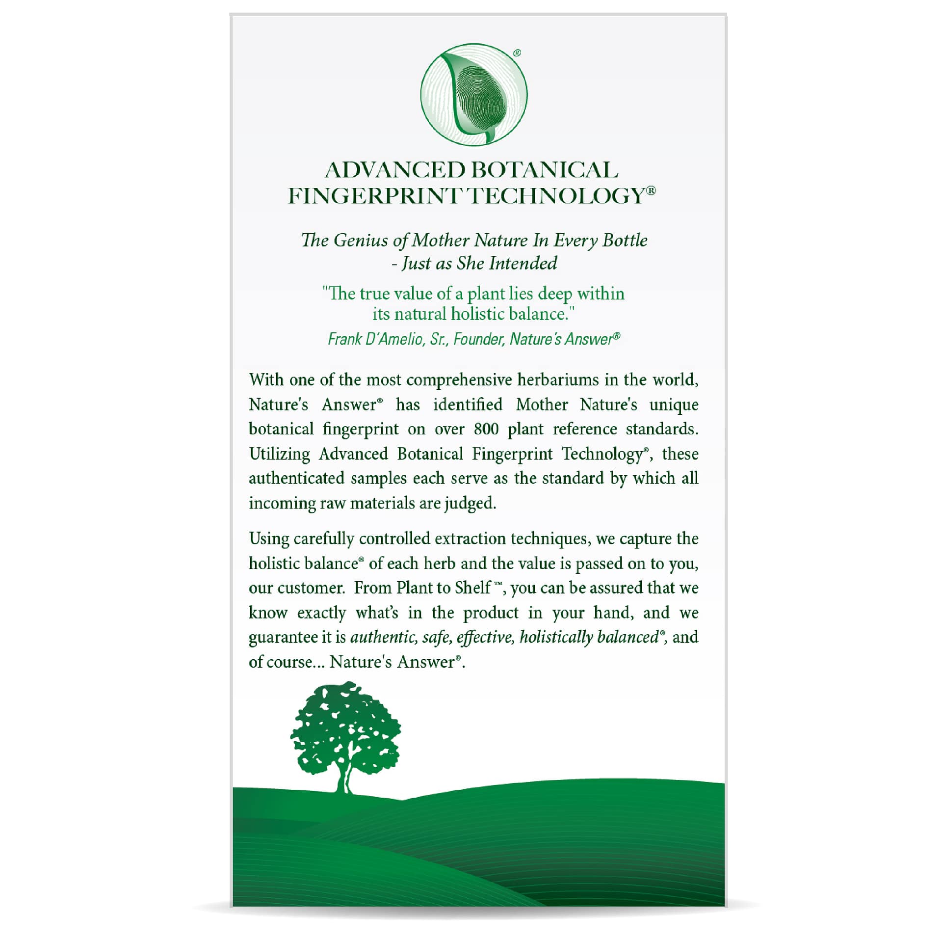 Nature’s Answer Bacopa is made with the added assurance of our Advanced Botanical Fingerprint Technology®. All plants have unique chemical characteristics, markers, and natural patterns that can be used to identify them (just like human fingerprints). Our in-house laboratory has accumulated and preserved over 800 plant specimens, creating one of the most comprehensive collections of genetically verified plant specimens found anywhere in the world. Our state-of-the-art laboratory equipment has identified each and every plant’s distinctive botanical fingerprint, which we then use as our baseline to analyze the quality and purity of every incoming botanical used to manufacture our products. This unique process is our Advanced Botanical Fingerprint Technology®, and we take great pride in knowing that it allows us to completely assure you that your products contain only the highest quality botanical ingredients.