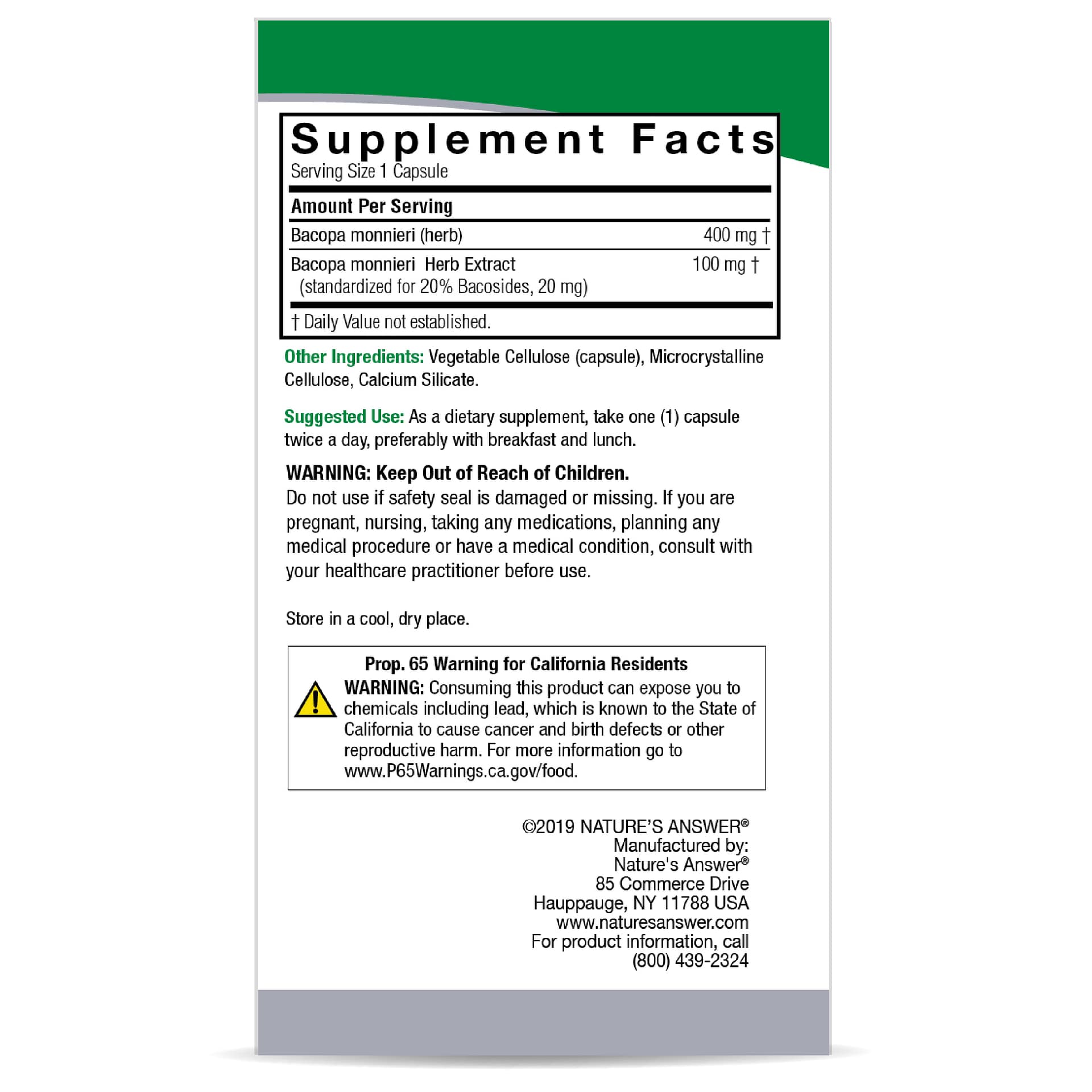 Nature’s Answer bacopa monnieri capsules combine Bacopa Standardized to 20% Bacosides, along with full spectrum Bacopa to assure that they deliver a wide range of natural constituents.