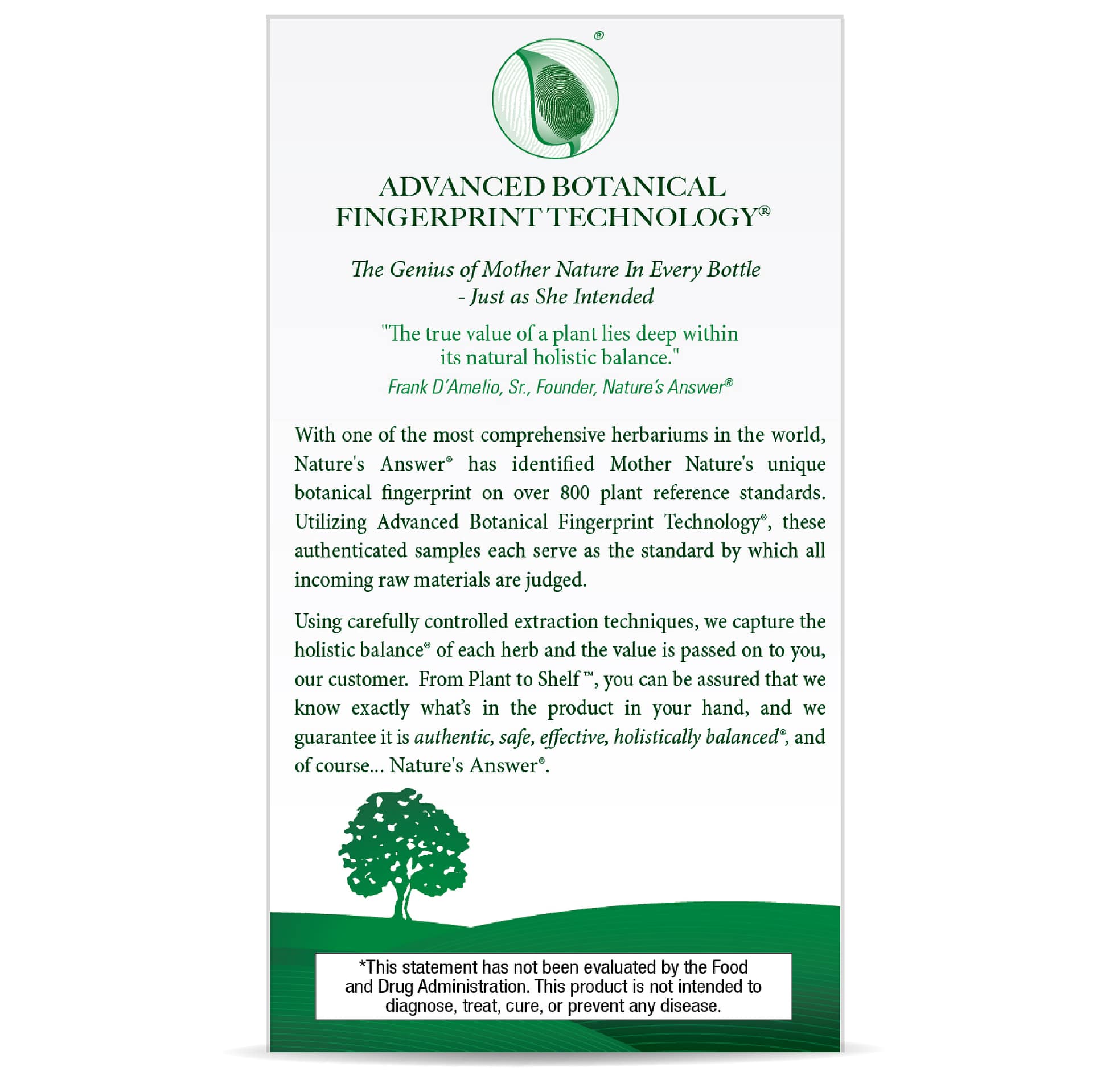 Nature’s Answer Boswellia Standardized veggie caps are made with the added assurance of our Advanced Botanical Fingerprint Technology®. All plants have unique chemical characteristics, markers, and natural patterns that can be used to identify them (just like human fingerprints). Our in-house laboratory has accumulated and preserved over 800 plant specimens, creating one of the most comprehensive collections of genetically verified plant specimens found anywhere in the world. Our state-of-the-art laboratory equipment has identified each and every plant’s distinctive botanical fingerprint, which we then use as our baseline to analyze the quality and purity of every incoming botanical used to manufacture our products. This unique process is our Advanced Botanical Fingerprint Technology®, and we take great pride in knowing that it allows us to completely assure you that your products contain only the highest quality botanical ingredients.