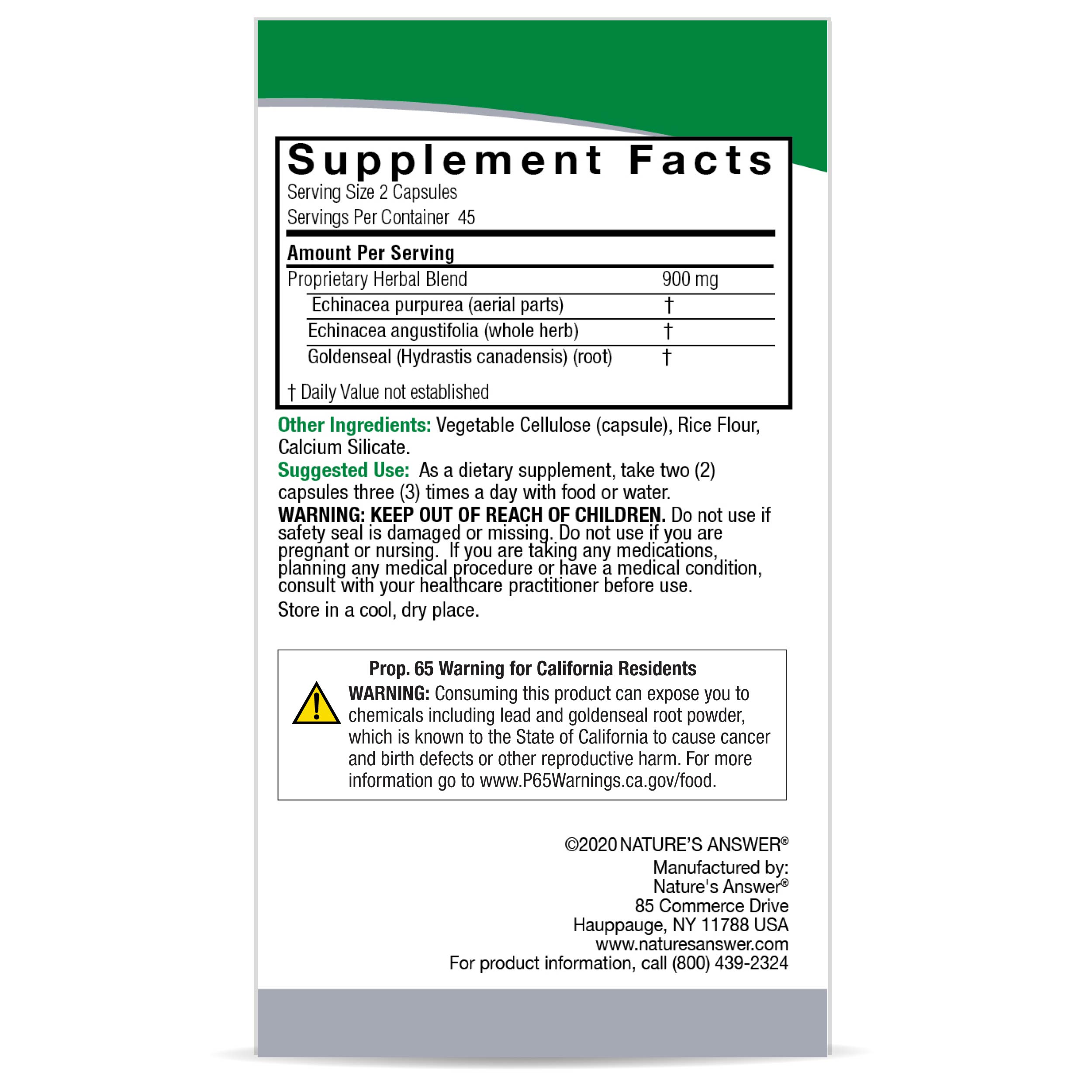 Each serving of Nature’s Answer Echinacea Goldenseal offers 900 mg of full spectrum herb