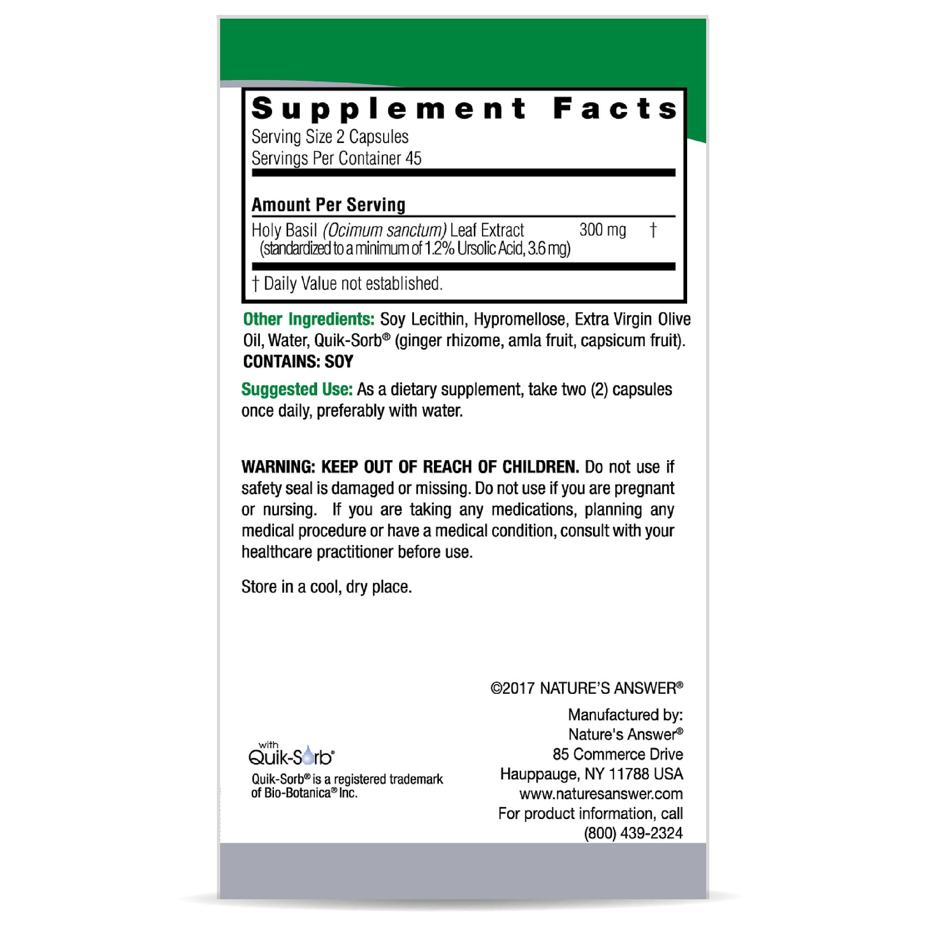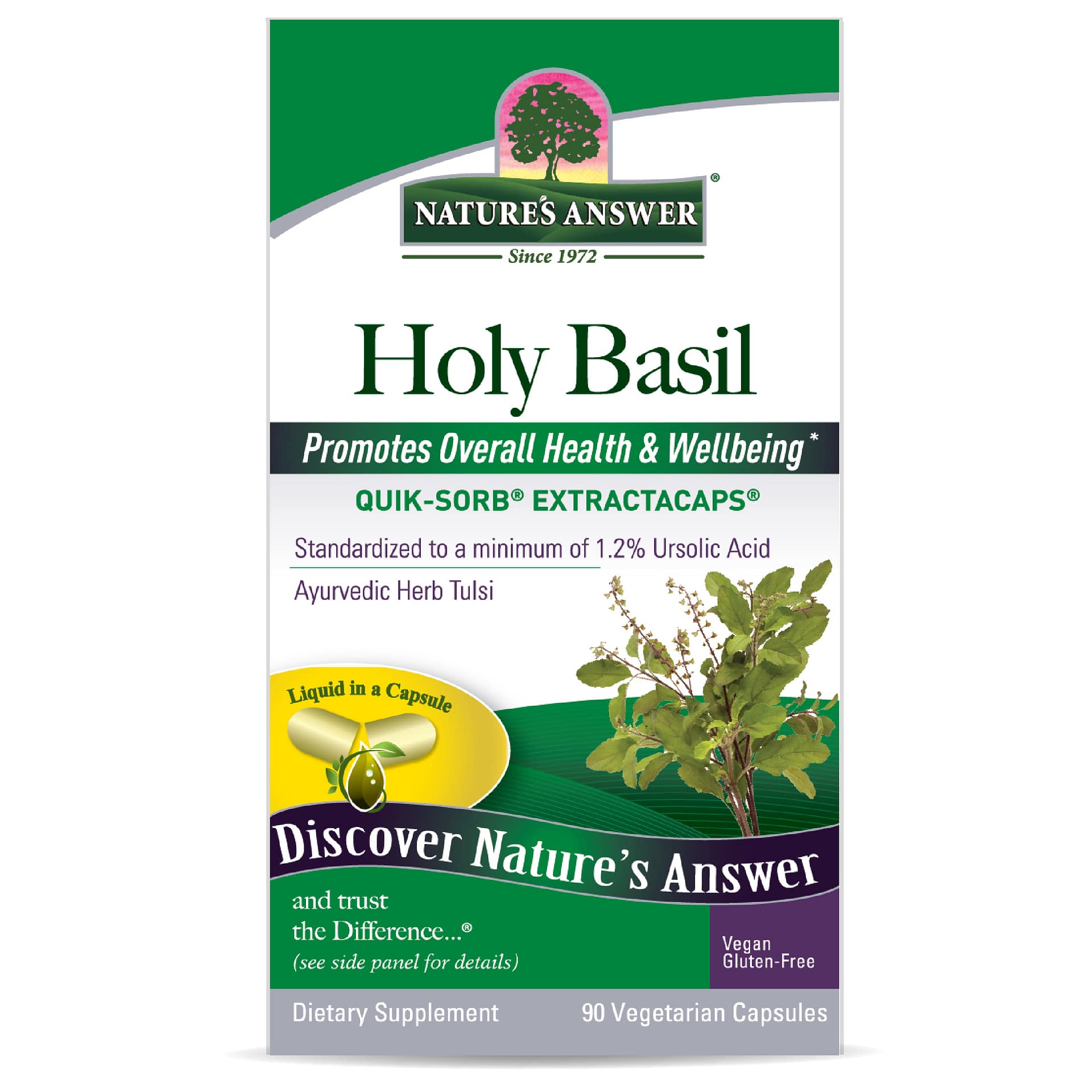Holy Basil from Nature’s Answer helps to support a healthy response to stress*. This holistically balanced formula features holy basil leaf extract, which is standardized to contain 2% ursolic acid. Nature’s Answer Extractacaps® are filled with easily absorbable liquid extract(s) and Quik-Sorb®, an exclusive blend of herbs known to enhance delivery of nutrients to the body*.