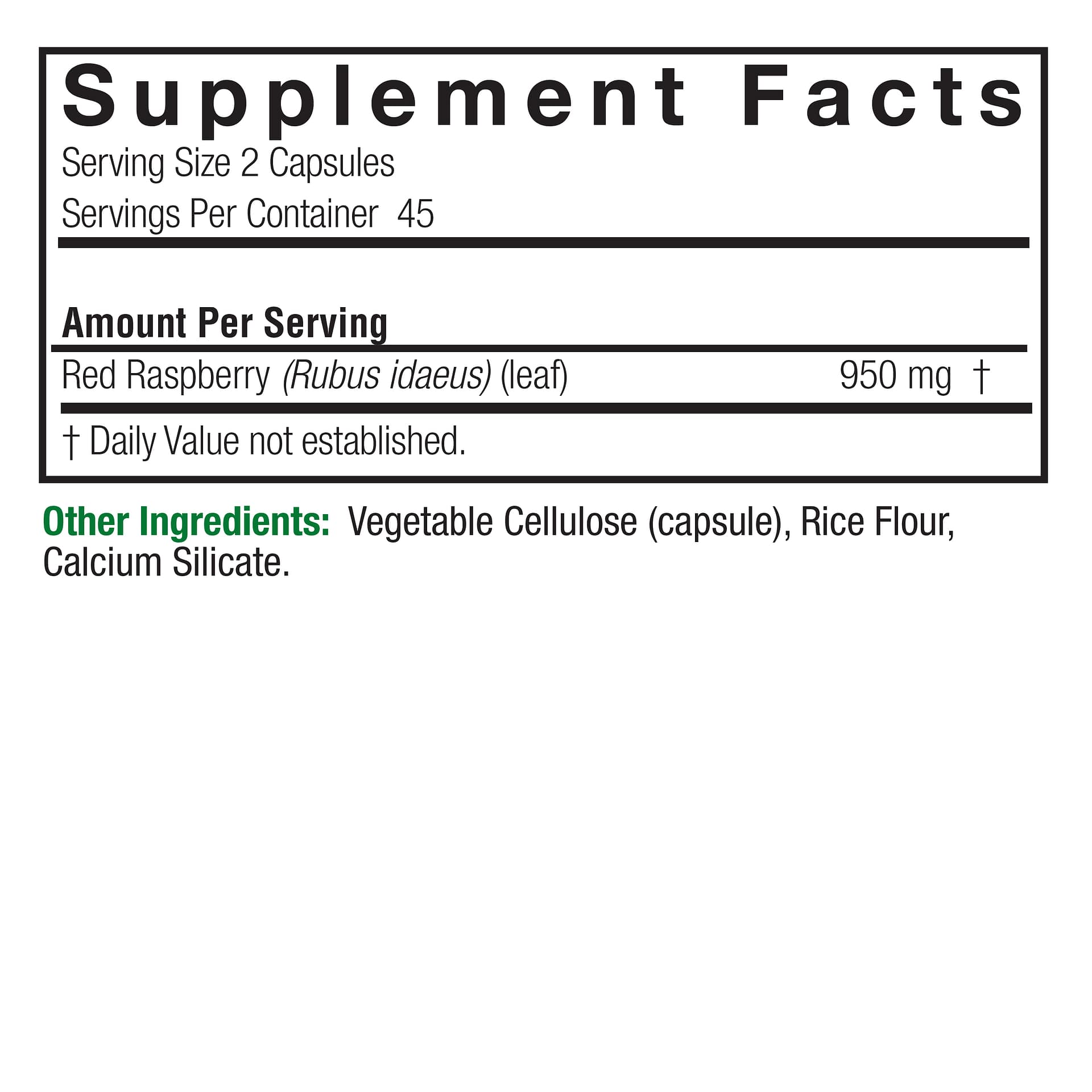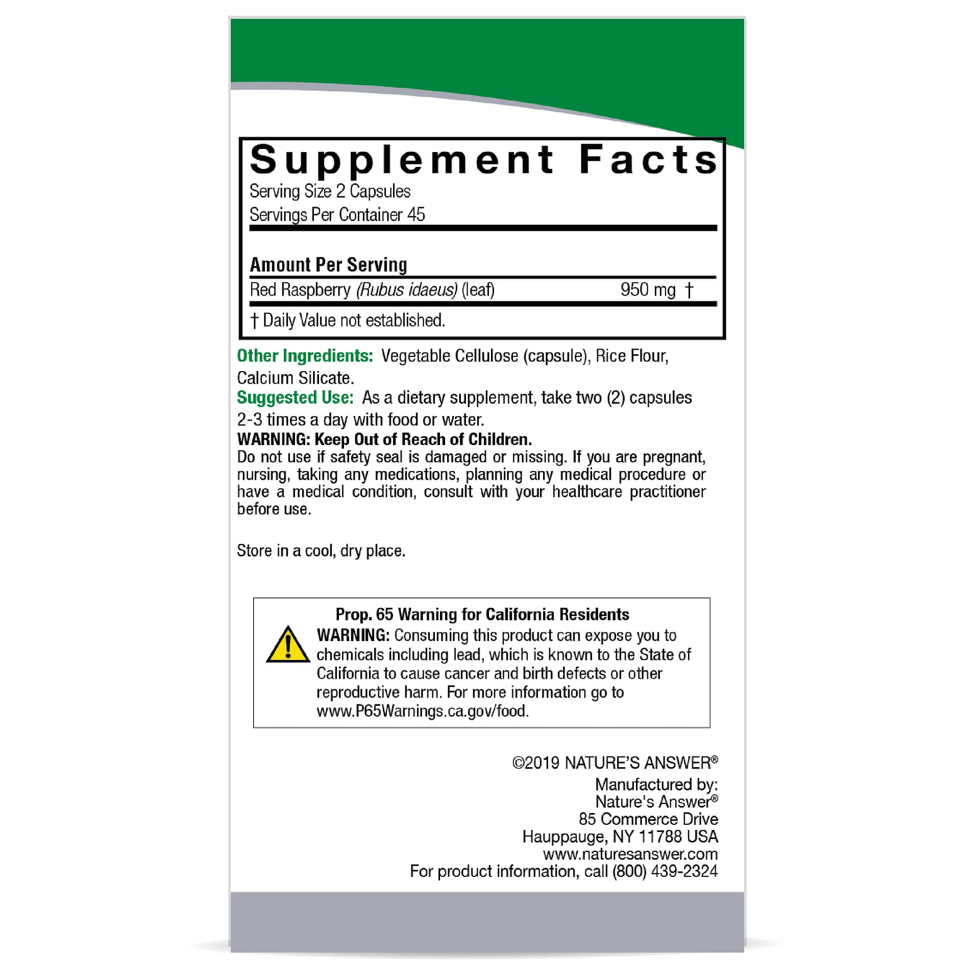 Skip to contentEach serving of Nature’s Answer Red Raspberry Leaf Veggie Caps offers 950 mg of Full Spectrum Herb