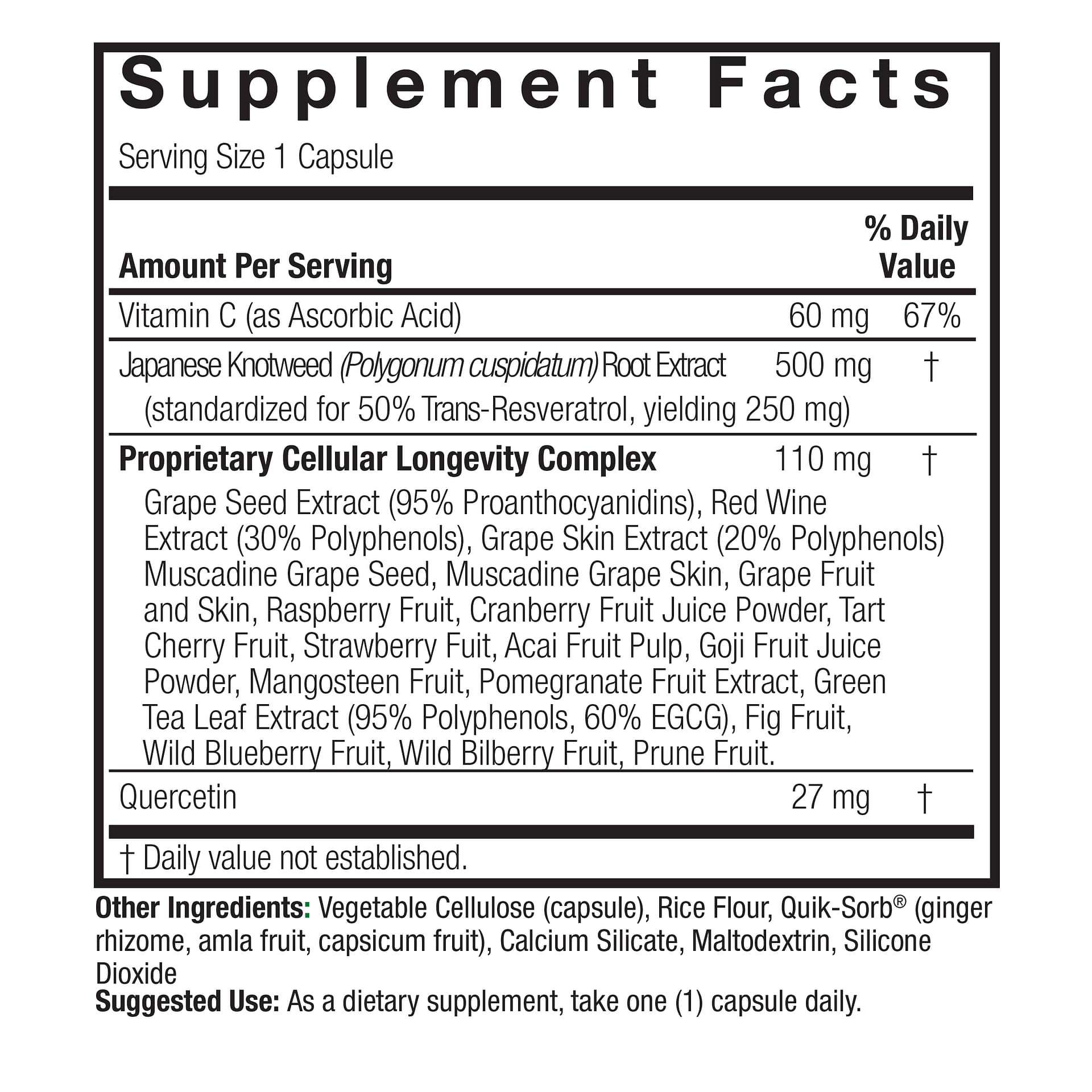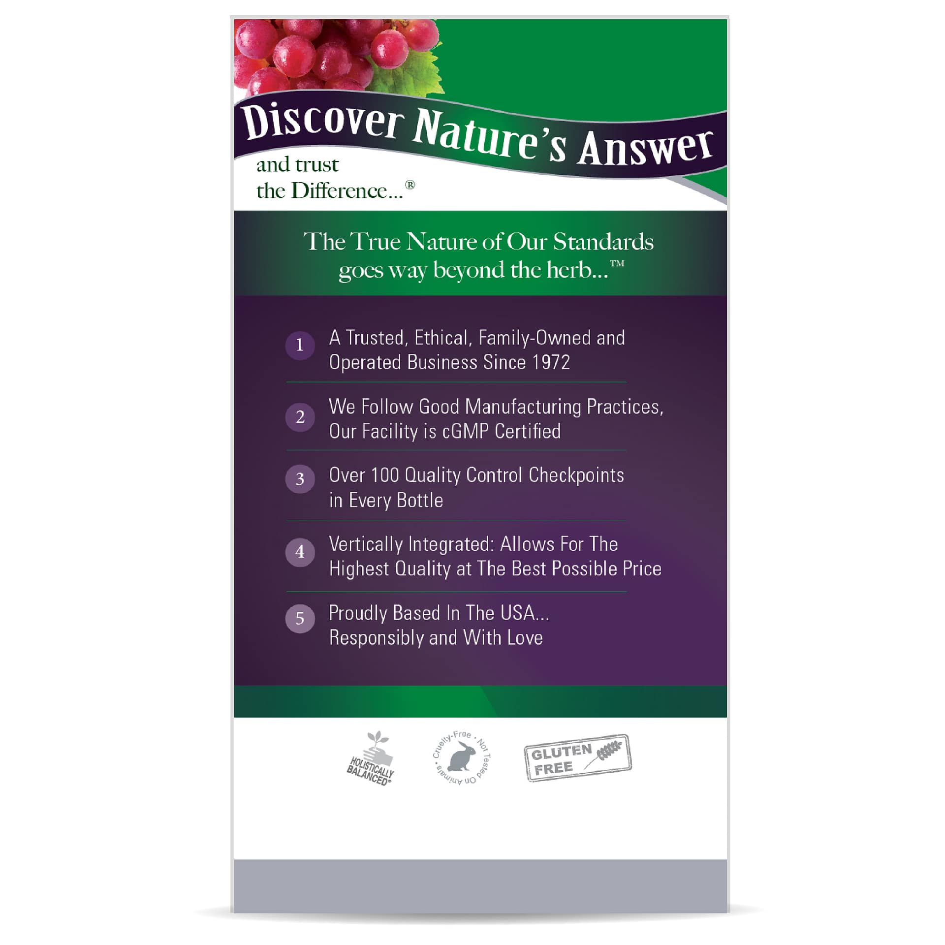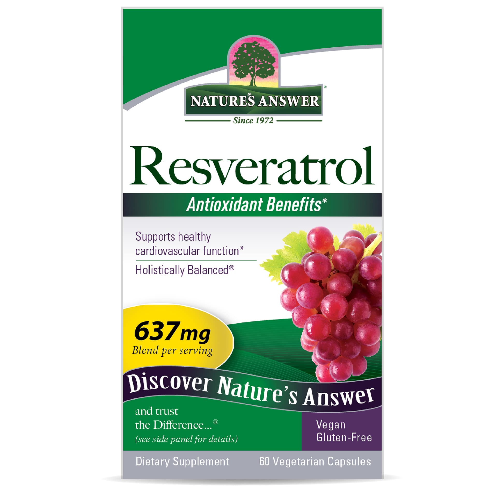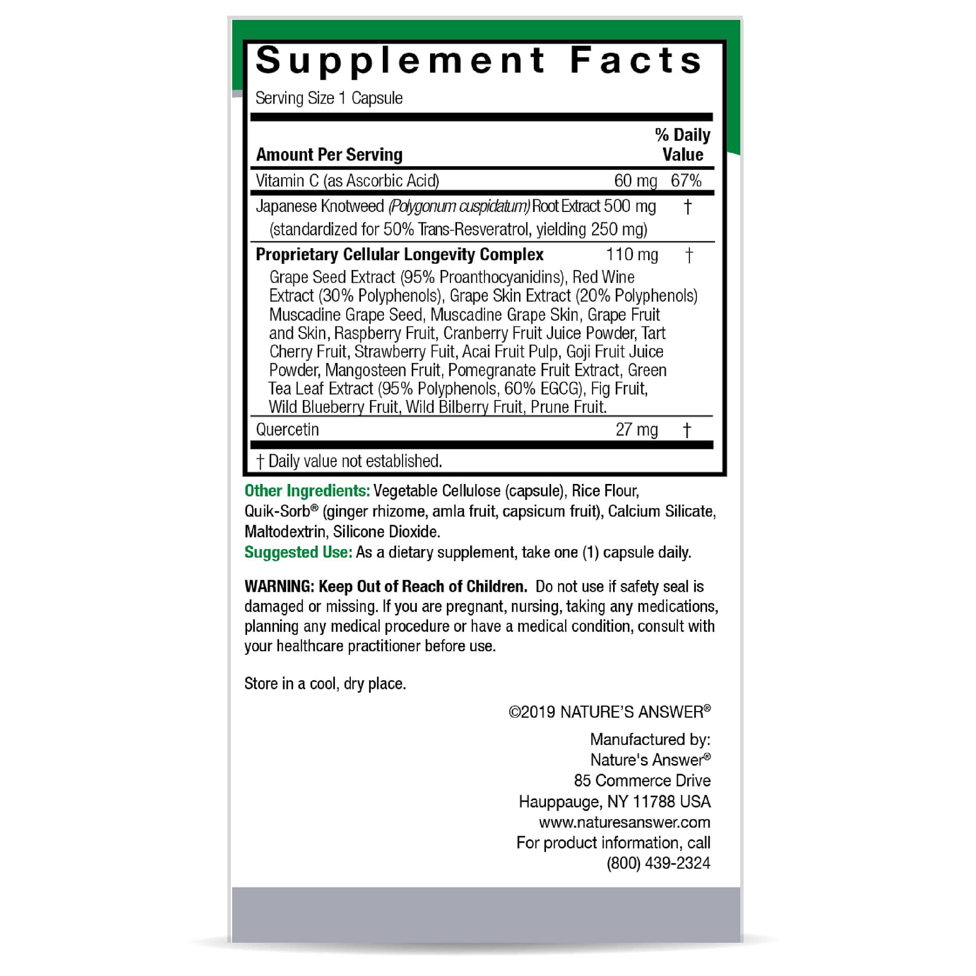 Resveratrol is a natural constituent that has been isolated from resveratrol sources such as grape seed, red wine, blueberries, red berries, and Japanese Knotweed (Polygonum cuspidatum). Muscadine is the species of grape known to have the highest concentration of ellagic acid and anthocyanins. Nature’s Answer’s Resveratrol Capsules offer Trans-Resveratrol [50% root extract yielding 250 mg ], and is further enhanced with a variety of fruits such as Muscadine Grape, Tart Cherry, Raspberry, Cranberry, Blueberry, Acai and more , along with Quik-Sorb® (ginger rhizome, amla fruit, capsicum fruit).